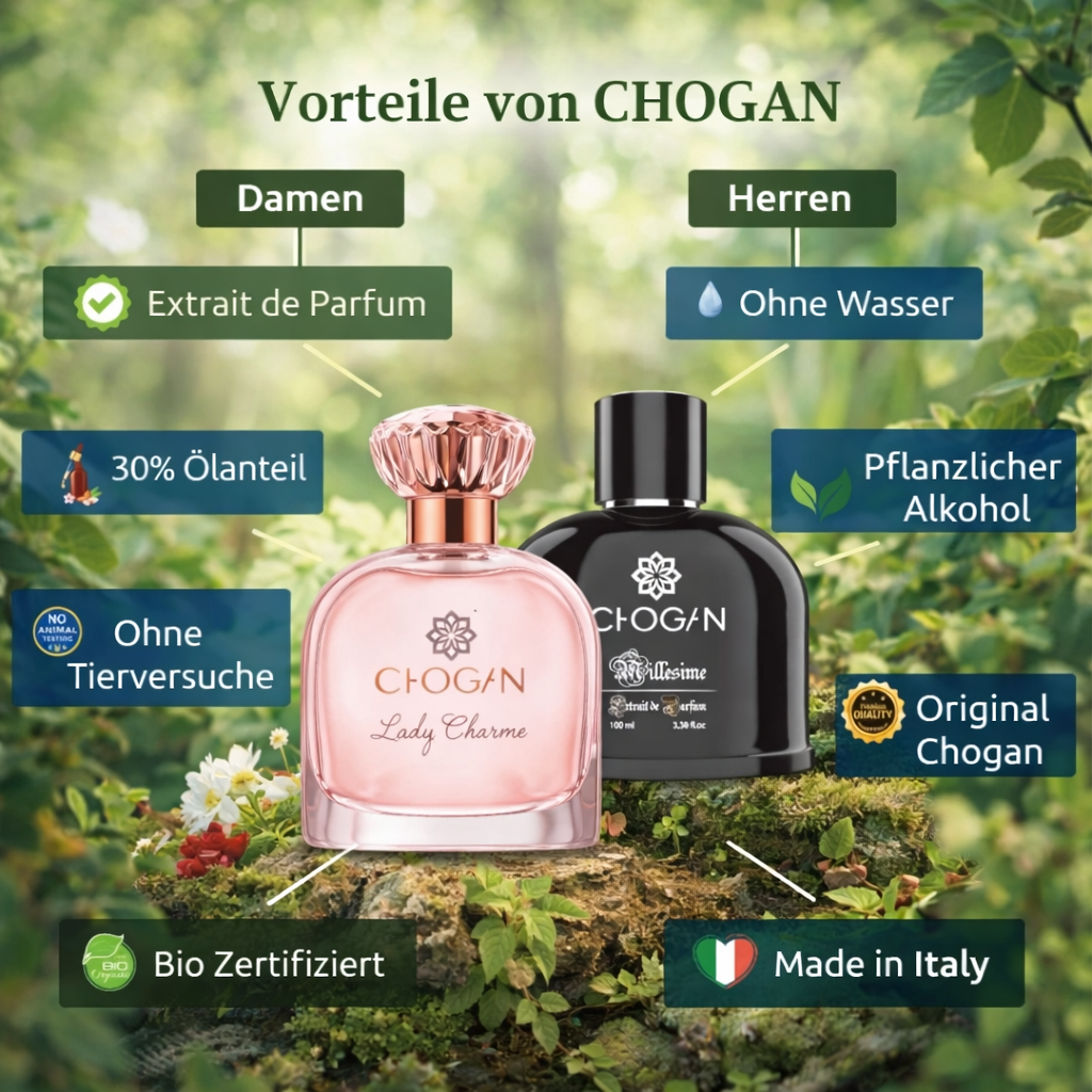 Chogan steht für hochwertige Parfums, Beautyprodukte, Pflege und Nahrungsergänzung, inspiriert von italienischer Leidenschaft und entwickelt mit Fokus auf Natürliche Balance, Qualität und Preisbewusstsein.