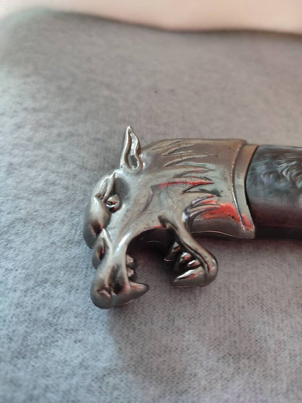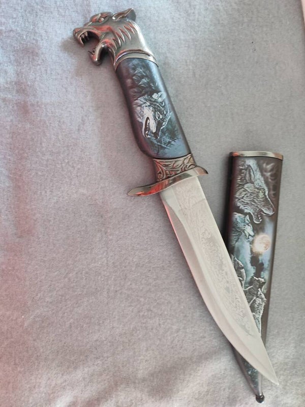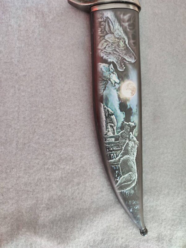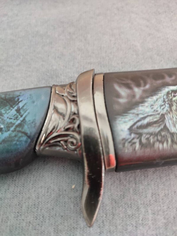 Dieser liebevoll gestaltete Dolch ist ein echter Hingucker. Der Knauf ist als Wolfskopf gefertigt worden. Der Griff und die Scheide sind mit buntern Wolfsabbildungen verziert. Ein ideales Geschenk für Liebhaber dieses außergewöhnlichen Tieres und Mittelalterfans.