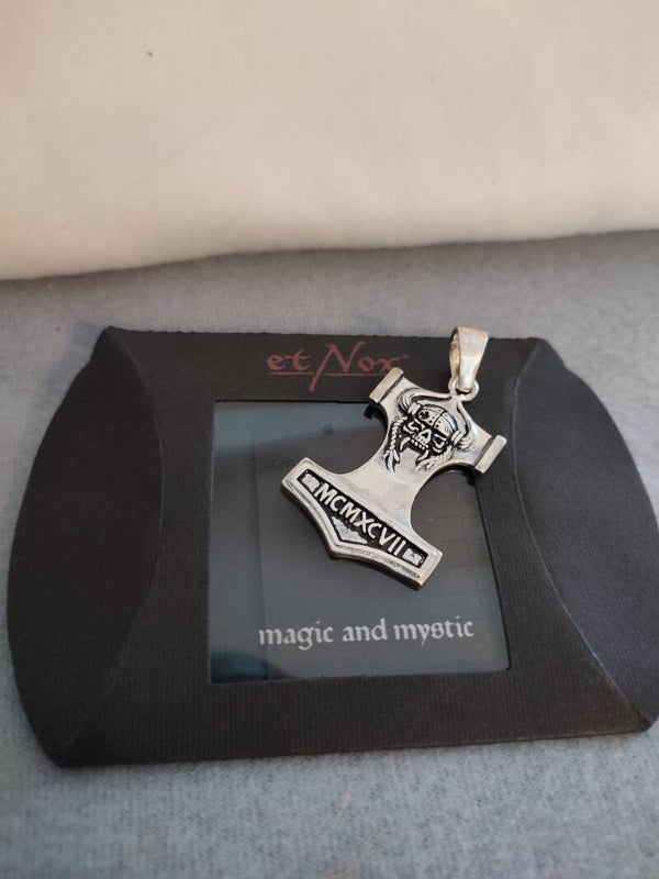 Dieser aus Bronze hergestellte Thors Hammer wurde versilbert, ein Wikingertotenkopf ziert den Hammer. Er ist ein echter Hingucker für den Krieger. Dieser Hammer kommt aus der Reihe Magic und Mystic von et Nox.