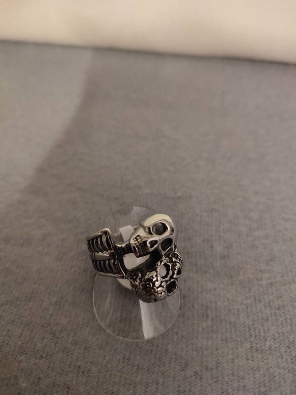 Diese beiden Totenköpfe schließen sich zusammen zu einem Ring aus Edelstahl. Aufwendig gefertigte Arbeit aus der Kollektion von et Nox.