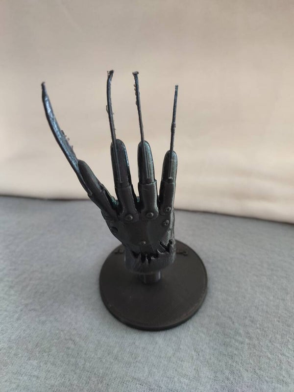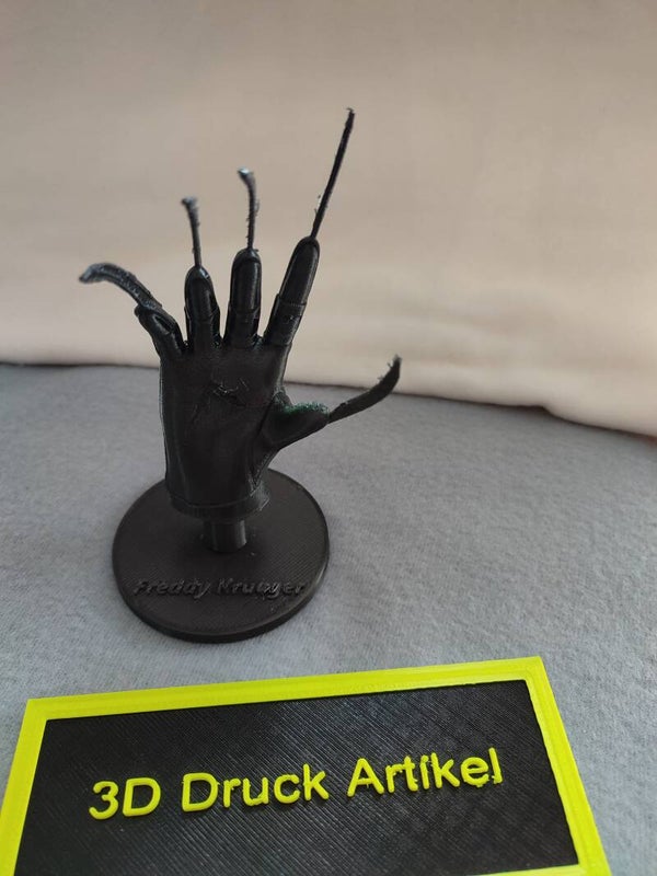 Hier seht ihr angelehnt an den kultigen Horrorfilm "Freddy Krüger" Die Hand mit den Messer Fingern ein echtes Highlight für Filmfans. Diese Hand wurde detalliert aus Filament gefertigt.