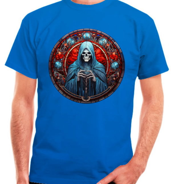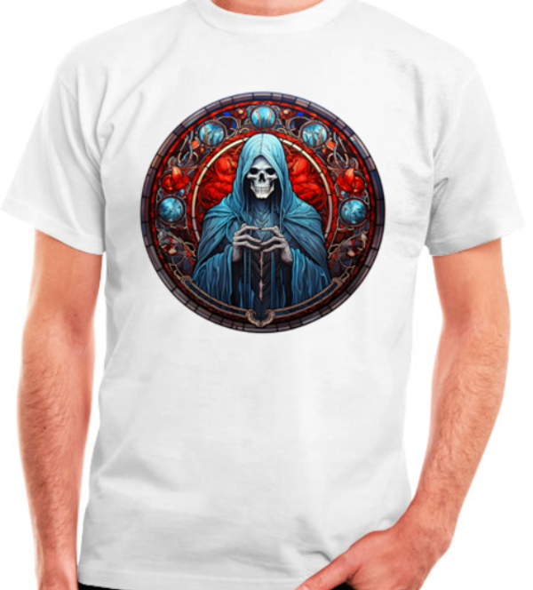 Das bequeme, luftige schwarze Baumwoll T-Shirt ist detalliert bedruckt. Das Glasornament im Hintergrund ist farblich verspielt und setzt den Skelett-Kapuzenmann ideal in den Vordergrund. Nicht nur an Halloween zu tragen, durch den "Unisex" Schnitt sowohl für Herren als auch Damen zu tragbar.