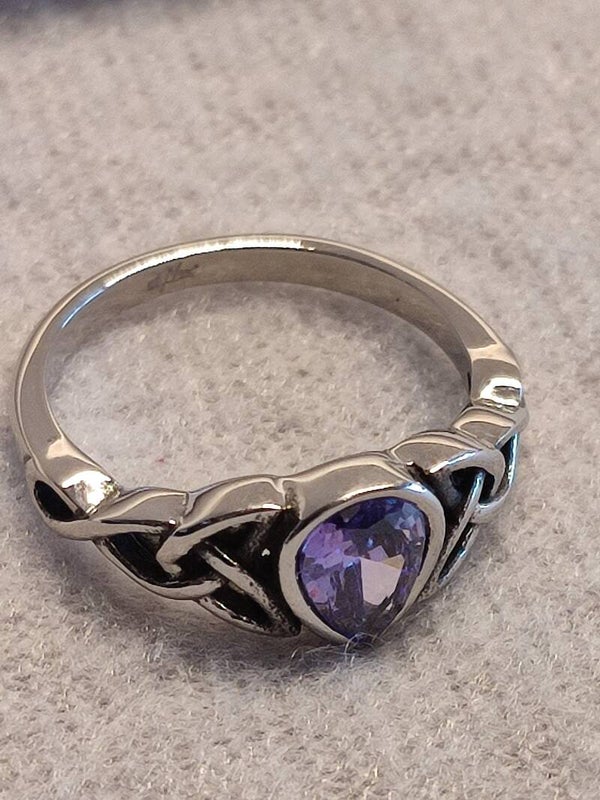 In Herzform ist der lila Zirkon in den keltisch verspielten Edelstahlring eingearbeitet. Durch die dezente Aufmachung ist der Ring nicht nur was für Liebhaber des Altertums.