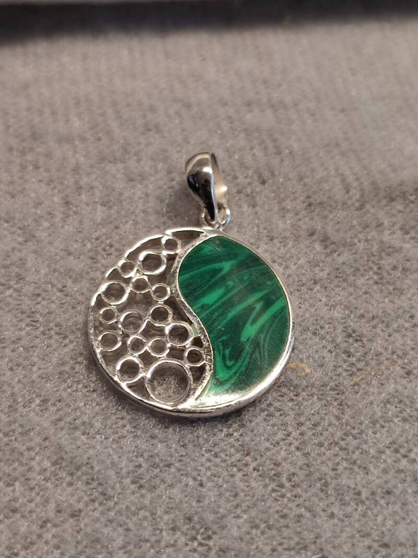Dieser wunderschöne und verspielt gerfertigte Kettenanhänger aus Silber wurde detalliert gefertigt die eine Seite verspielt gestaltet und auf der Anderen Seite der grünemarmorierte Einlass. Ein traumhaftes Geschenk für besondere Tage.