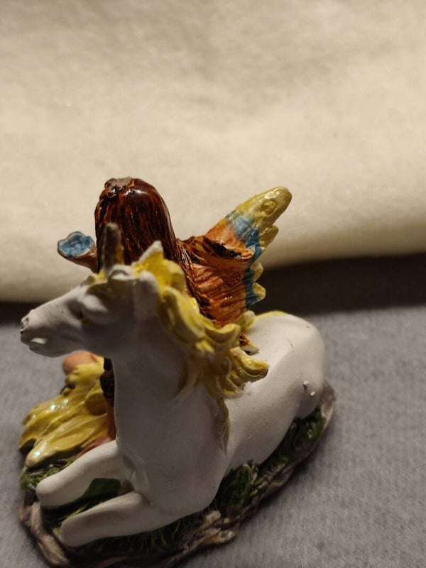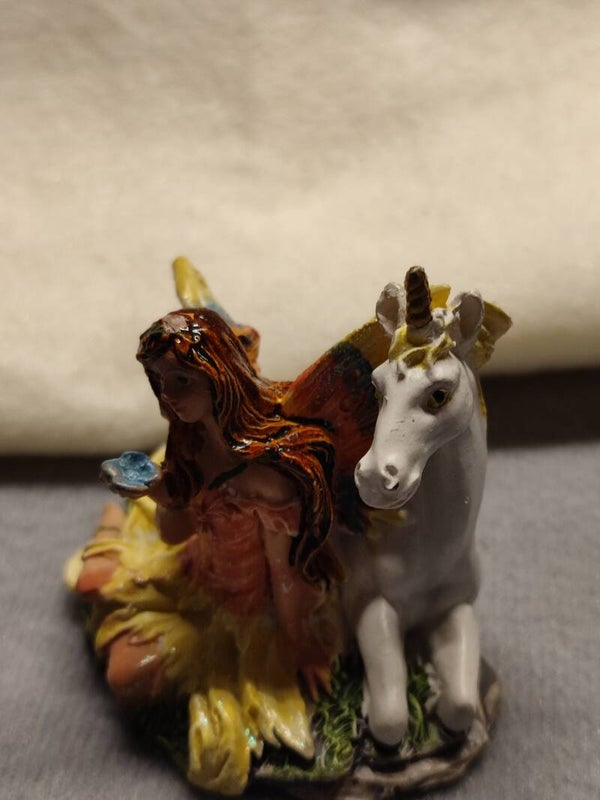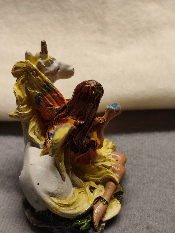 Dieses kleine Pärchen sitzt gemeinsam im Gras. Traumhafte Kombination für jeden Liebhaber der Magischen Welt. Golden Haariges Einhorn trifft auf Braunhaariges Feenmädchen. Sie trägt ein goldenes Blütenkleid.