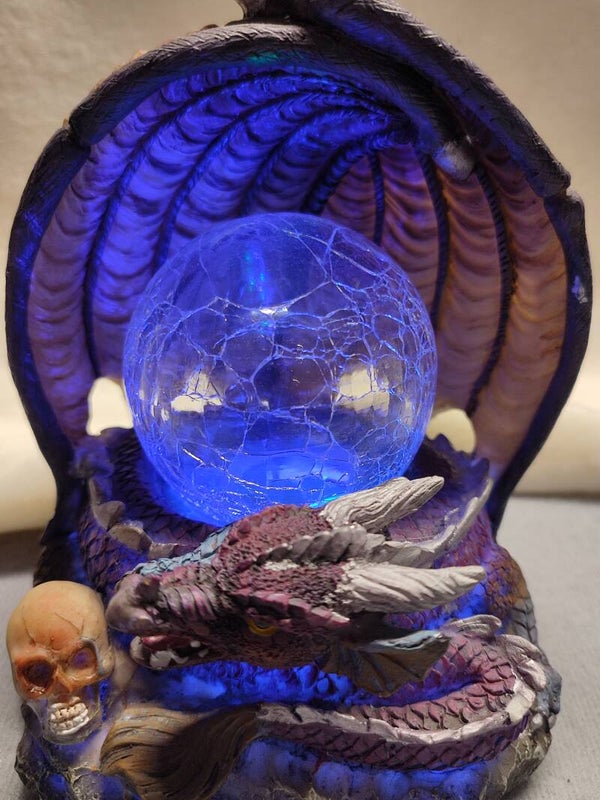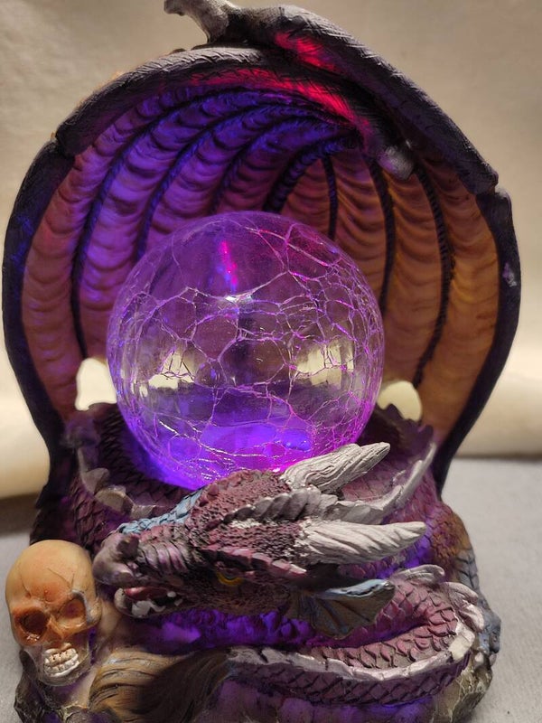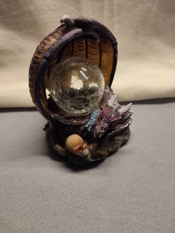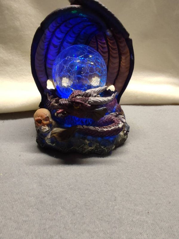 Dieser detalliert gestaltete Drache, ist ein wahrer Hingucker. In schlafender Position beschützt er die Glaskugel mit seinen imposanten Flügeln. Die Kugel wird durch Batterien betrieben und hat einen Farbwechseler integriert, die diesen Prachtvollen Magischen Wesen in eine wahre Augenweide verwandelt.