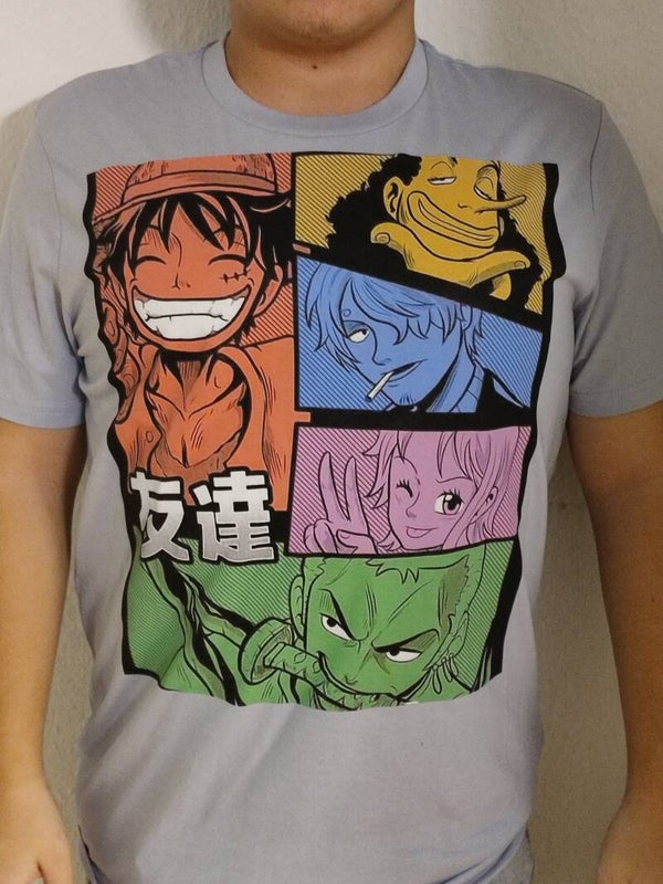 Dieses hellblau/graue Baumwoll T-Shirt mit dem Aufdruck der Strohhut-Bande ist nur bei Schmollis Freaky-Corner erhältlich.