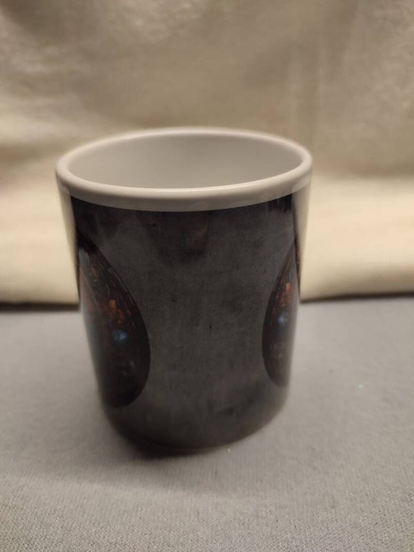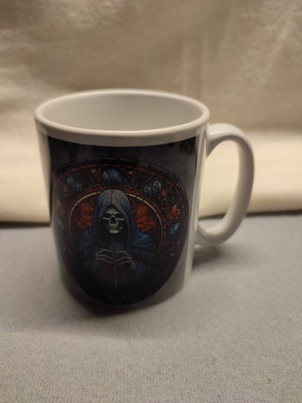 Das Glasornament Death wurde auf einem graumarmorierten Hintergrund gedruckt und erhält dadurch einen mystischen Flair. Die Farebenvielfalt gerät durch den Kontrast in den Vordergrund, eine Tasse für Jeden der herausstechen möchte!