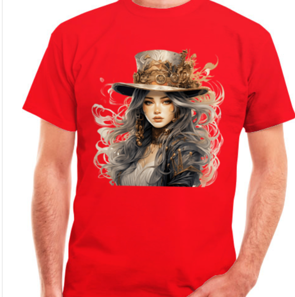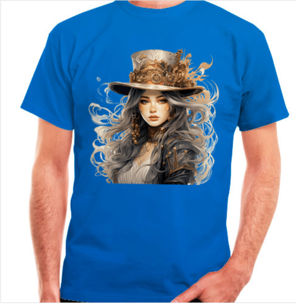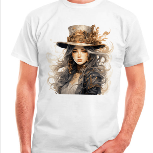 Eine junge Frau im Steampunk Design ziert diese T-Shirts, ein wahrer Eyecatcher.