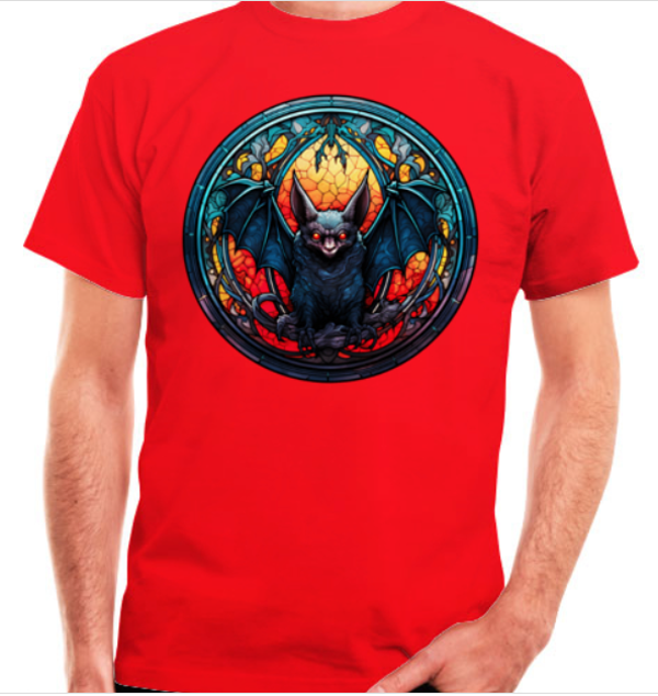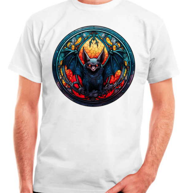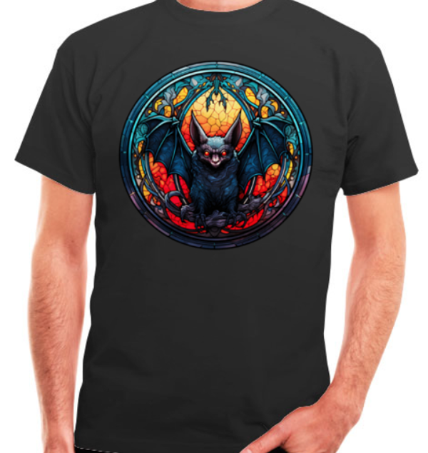 Die fliegenden Freunde Draculas sind im Glasdesign verewigt worden und zieren die front des T-Shirts, ein Highlight für jeden Freund des Gruselns.