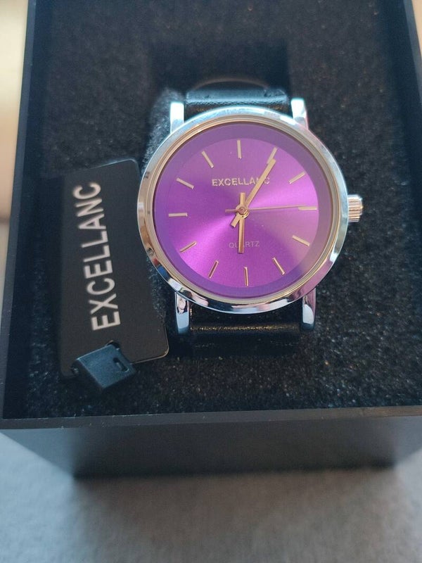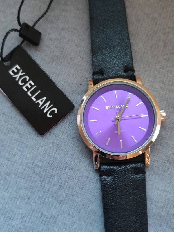 Diese schlichte und stilsichere Damenarmbanduhr aus schwarzem Lederimitat hat ein lilafarbenes Ziffernblatt, das ein farbliches Highlight bietet.