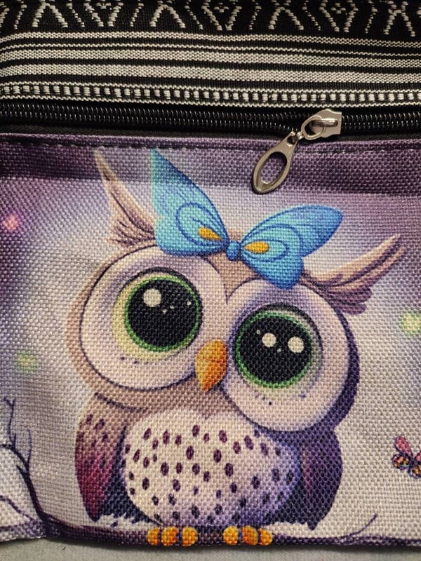 Diese kleine Handtasche ist auf der Front mit einer niedlichen Eule bedruckt auf der Rückseite ist ein Muster eingewoben.