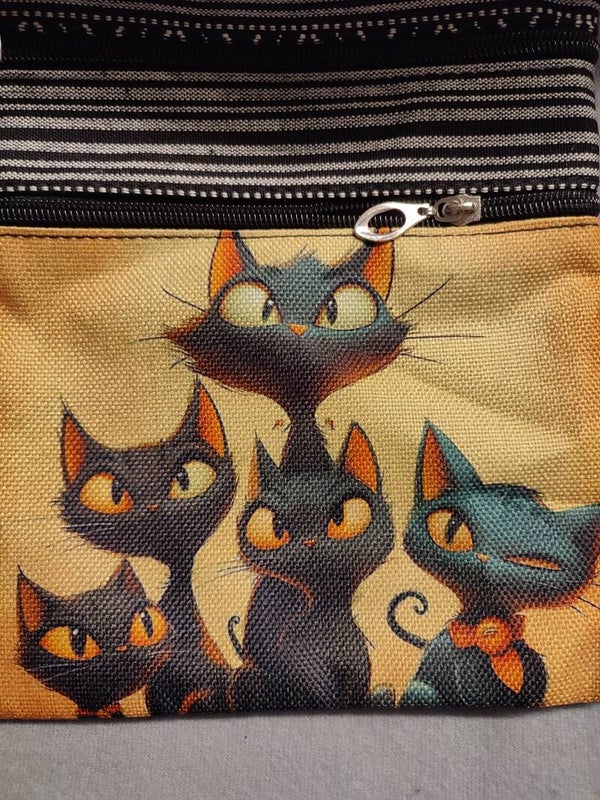 Diese kleine Handtasche ist auf der Front mit einer niedliche Katzenfamilie bedruckt auf der Rückseite ist ein Muster eingewoben.