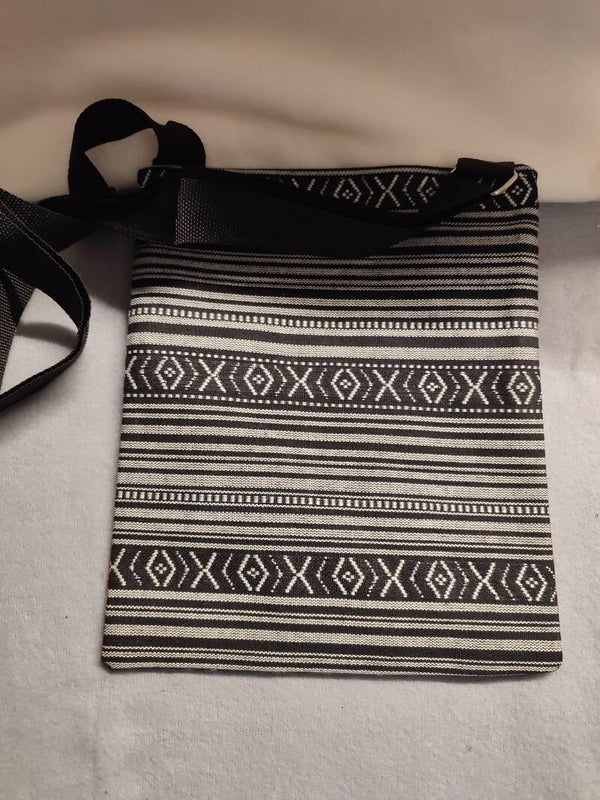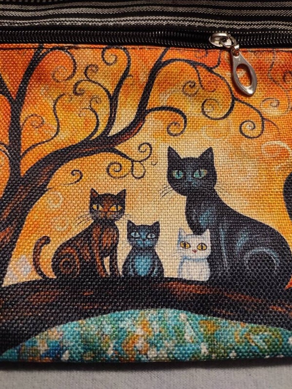 Diese kleine Handtasche ist auf der Front mit einer niedlichen Katzenfamilie bedruckt auf der Rückseite ist ein Muster eingewoben.