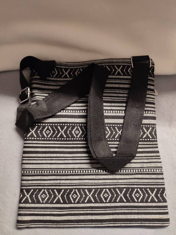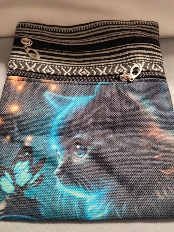 Diese kleine Handtasche ist auf der Front mit einer traumhaften Abbildung einer Katze und eines Schmetterlings bedruckt auf der Rückseite ist ein Muster eingewoben.