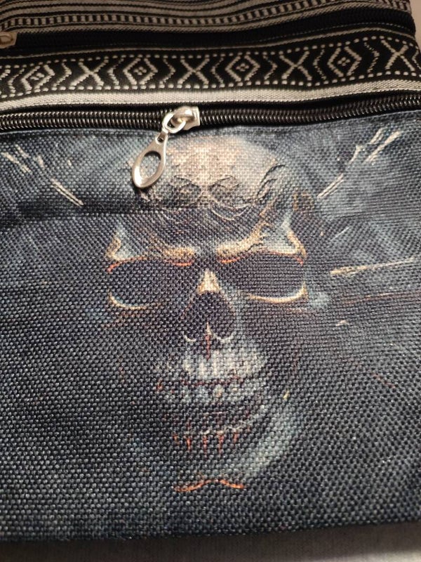 Majestätisch thront auf der Mini handtasche der Totenkopf auf der Frontseite, ein wahrer Eyecatcher, auf der Rückseite ist ein Muster eingewoben.