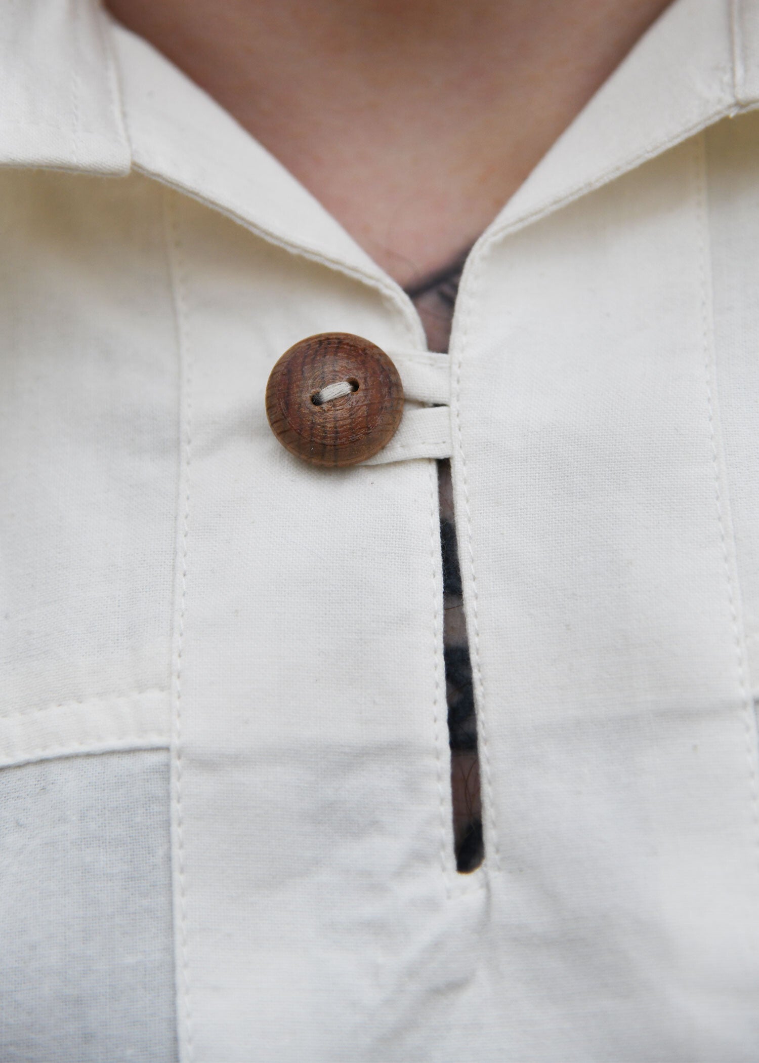 Es hat einen Kragen und eine breite, gedoppelte Schulterpasse. Der Ausschnitt und die Manschetten sind mit Holzknöpfen versehen. Das Rückteil ist etwas länger geschnitten, damit es dem Handwerker bei der Arbeit nicht aus der Hose rutscht.